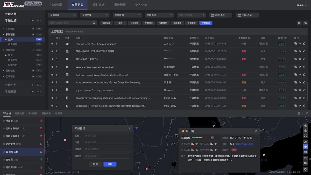 以公正、客觀、獨(dú)立的中國視角對(duì)海外安全風(fēng)險(xiǎn)形勢(shì)進(jìn)行評(píng)估,通過聚合分析不同國別和區(qū)域安全風(fēng)險(xiǎn)事件的要素信息,對(duì)我國駐外機(jī)構(gòu)、海外僑胞等提供實(shí)時(shí)安全風(fēng)險(xiǎn)預(yù)警,減低安全風(fēng)險(xiǎn)事件對(duì)我國重大工程造成的損失,提升海外人員的安全意識(shí)。