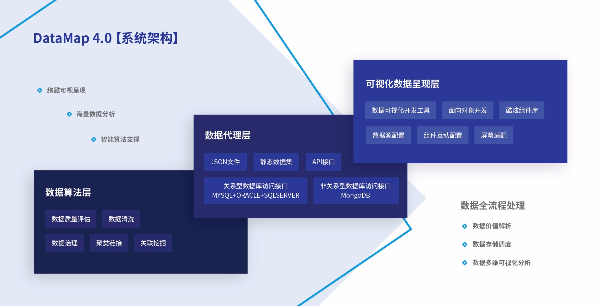 “大數(shù)據(jù)管理平臺(tái)”是基于Apache Hadoop提供海量數(shù)據(jù)存儲(chǔ)和多種高性能計(jì)算框架,覆蓋數(shù)據(jù)存儲(chǔ)、批處理運(yùn)算、實(shí)時(shí)計(jì)算、數(shù)據(jù)ETL、SQL引擎、工作流引擎、任務(wù)管理等多個(gè)方面,使用Hadoop生態(tài)系統(tǒng)中的開(kāi)源技術(shù)作為基礎(chǔ)的技術(shù),支撐多種計(jì)算類(lèi)型的應(yīng)用的混合負(fù)載,如批處理應(yīng)用、交互式查詢(xún)、高頻讀寫(xiě)、全文檢索、數(shù)據(jù)挖掘和實(shí)時(shí)流計(jì)算等多種計(jì)算類(lèi)型。產(chǎn)品同時(shí)提供完整的安全保障體系、圖形化的平臺(tái)管理、數(shù)據(jù)作業(yè)、數(shù)據(jù)引擎、企業(yè)級(jí)安全管理以及實(shí)時(shí)增量數(shù)據(jù)同步工具。